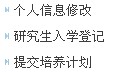 (2) 点击【培养管理】菜单,完成“个人信息修改”、“研究生入学登记”和“提交培养计划”三个操作并保存提交。如图:
