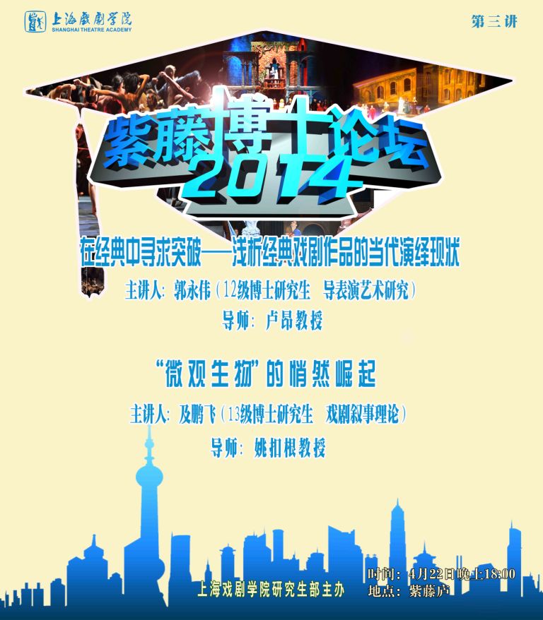 (1)主题:在经典中寻求突破——浅析经典戏剧作品的当代演绎现状,主讲:郭永伟(2012级博士),研究方向:导表演艺术研究,导师:卢昂教授