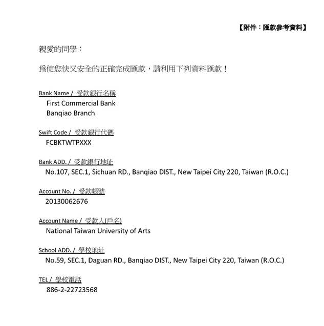 请研究生务必于12月8日下午3点前将40000台币汇入台湾艺术大学提供的帐号(见附件)。汇款完成后请务必保留汇款凭证并扫描发送邮件至研究生部邮箱。研究生部将转发给台湾艺术大学作为报名和汇款的依据。