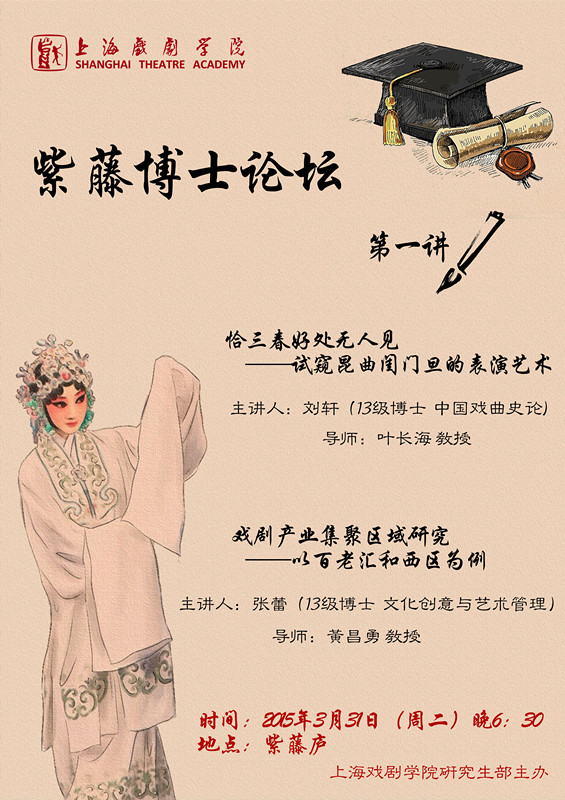 本学期共举办八讲,每讲要求与开讲博士同一研究方向的硕士必须参加!本讲要求中国戏曲史论和艺术管理研究方向的硕士研究生必须参加。同时欢迎其他专业同学们积极参与,每次参加讲座同学可得0.1实践学分!2013级、2014级博士研究生参与次数不得少于5次,将与博士评奖评优等挂钩。