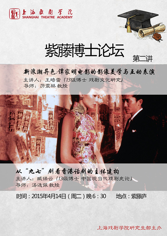 主讲人:王培雷,13级博士,题目: 《新浪潮异色:谭家明电影的影像美学与互动表演》。研究方向:戏剧文化研究,导师:厉震林教授