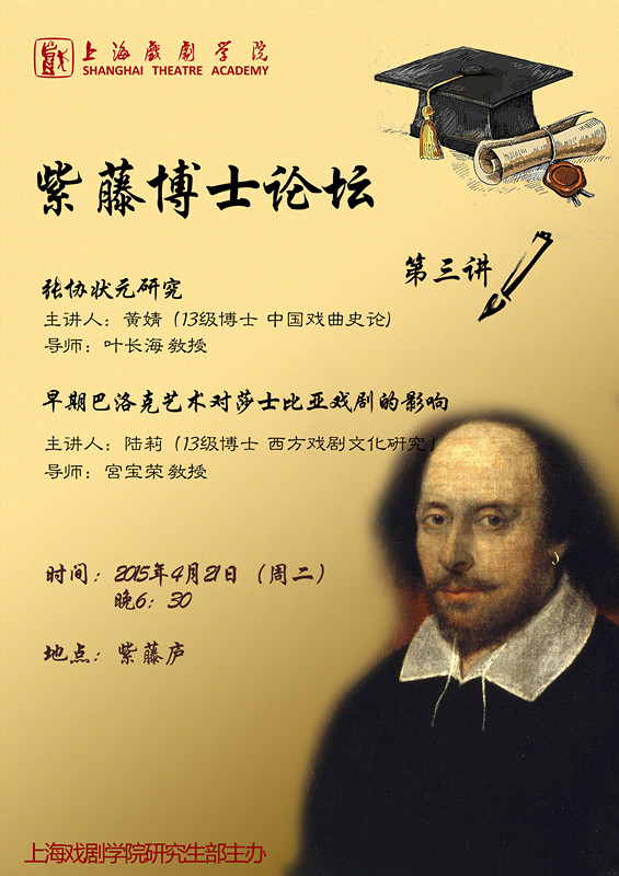 主讲人:陆莉,13级博士,题目:早期巴洛克艺术对莎士比亚戏剧的影响研究方向:西方戏剧文化研究,导师:宫宝荣教授