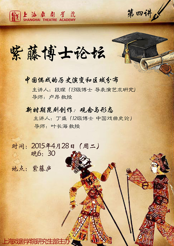 欢迎参与!本讲要求导表演艺术研究、中国戏曲史论等研究方向的硕士研究生必须参加。同时欢迎其他专业同学们积极参与,每次参加讲座同学可得0.1实践学分!2013级、2014级博士研究生参与次数不得少于2/3,将与博士评奖评优等挂钩。