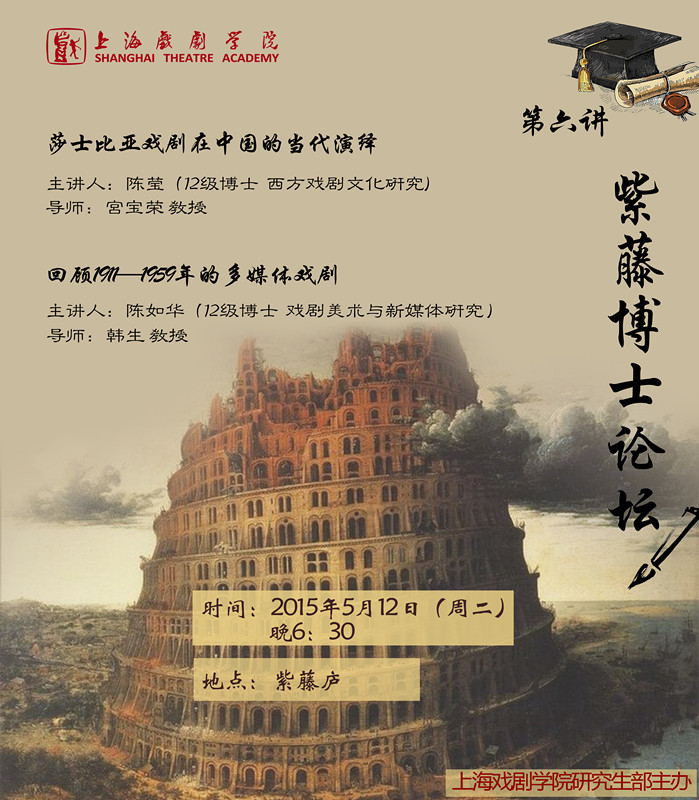 欢迎参与!本讲要求西方戏剧文化研究、戏剧美术与新媒体研究等研究方向的硕士研究生必须参加。同时欢迎其他专业同学们积极参与,每次参加讲座同学可得0.1实践学分!2013级、2014级博士研究生参与次数不得少于2/3,将与博士评奖评优等挂钩