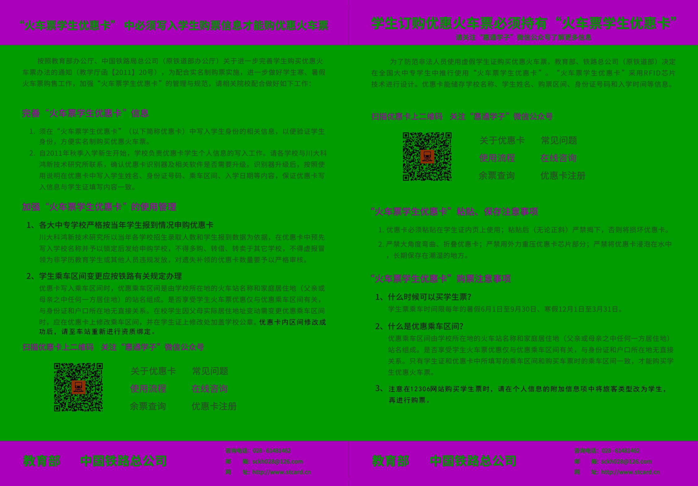 3、学生在火车站窗口或自助售取票机绑定学生资质时,由于优惠卡内区间写入不规范(例如:四川成都、成都市、成都站等不规范的站点名称)导致无法绑定学生资质。请回学校找到优惠卡信息管理的老师,修改优惠卡内不规范的站点名称(注意:学生优惠卡内区间修改后必须至火车站重新绑定学生资质,再进行购票)。正确的站点应写入“成都、成都东、成都西或成都南”。